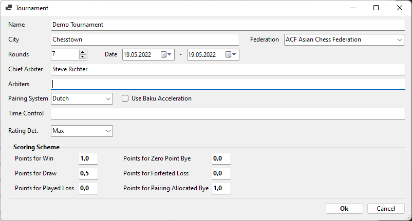 For the purpose of this tutorial it's sufficient to enter Name, City and a Chief Arbiter. Enter some values there and press ok